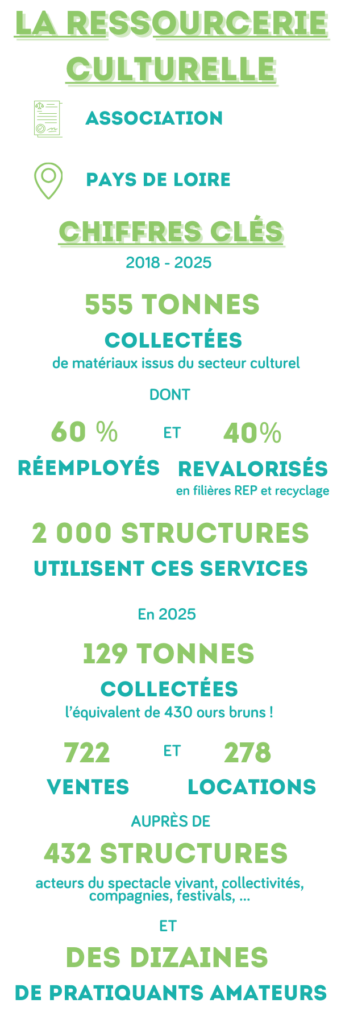 Depuis 2018, nous avons collecté plus de 550 tonnes auprès de structures culturelles (théâtre, opéra, festivals, compagnies, studio de cinéma…). Ces équipements, une fois triés et valorisés, sont remis en circulation via notre boutique ou proposés à la location.